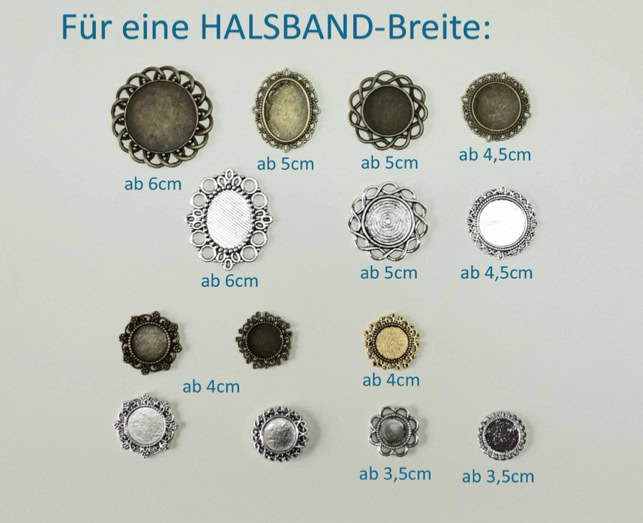 Wem das nicht genügt, der kann zusätzlich noch eine Borte oder eine Cabochon-Fassung auswählen. Das Glas des Cabochons wird nach Wunsch passend zum Halsband bedruckt.